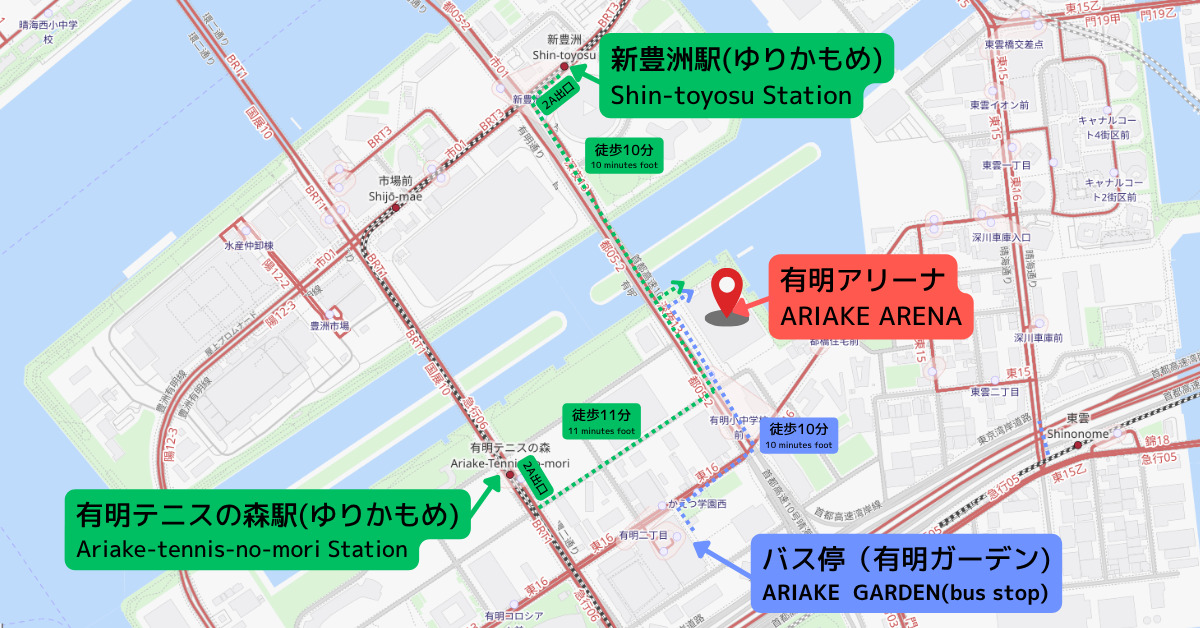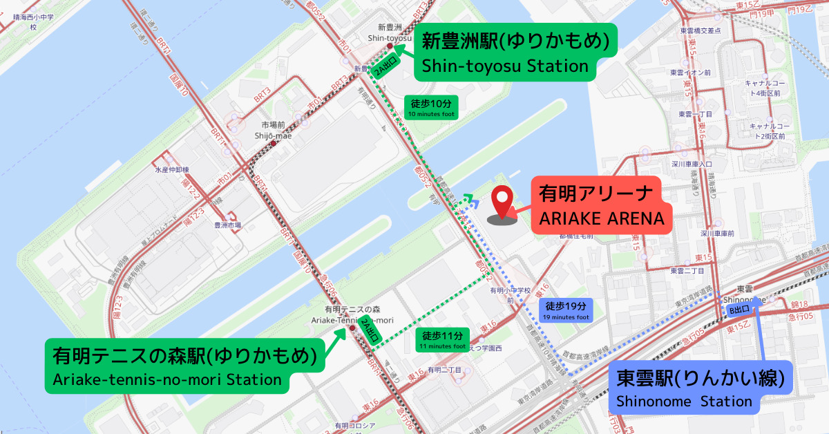 有明アリーナの最寄り駅はゆりかもめの路線となっています。ゆりかもめの路線のうち、新豊洲駅と有明テニスの森の2駅どちらも有明アリーナへの徒歩距離は同程度となっています。新豊洲駅の方が若干有明アリーナに距離が近いですが、橋の上を歩くので雨風が強いなどの天気の悪い日は有明テニスの森駅の利用をおすすめします。