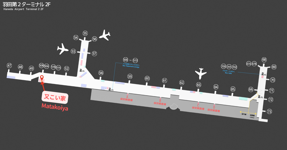 又こい家は羽田第2ターミナル国内線を利用する場合、50番搭乗口の近くにあります。