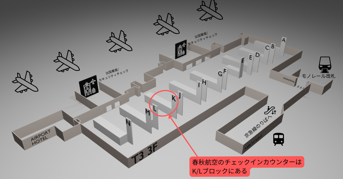 春秋航空のチェックインカウンターのある第3ターミナル3FのK/Lブロックは以下の場所にあります。
