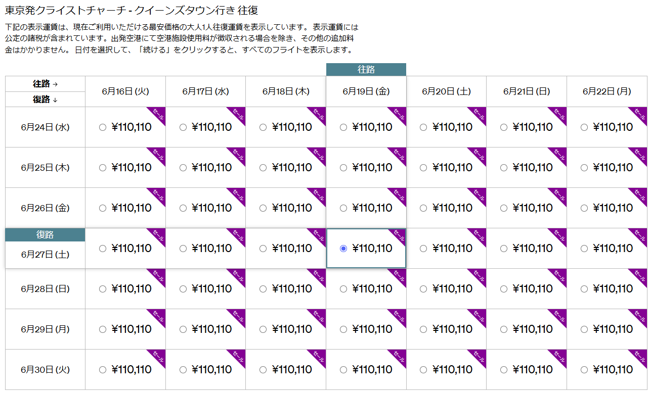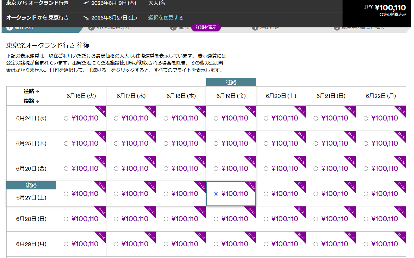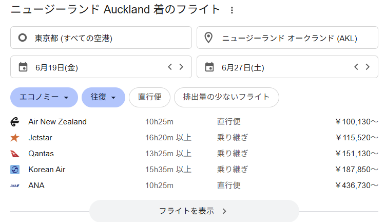 例えば6/19-27で成田⇔オークランドの往復航空券は下記画像のように約10万円となっています。