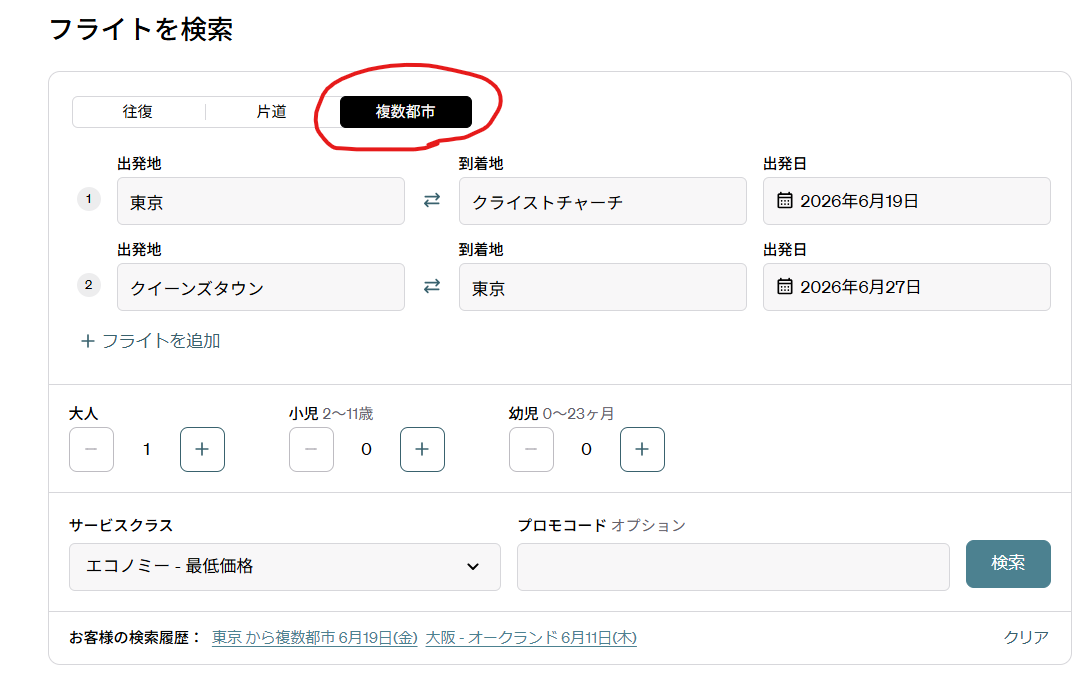 航空券を検索する際に下記画像の複数都市のところを選んで、ニュージーランド南島を周遊する際の定番ルートの行きはクライストチャーチ、帰りはクイーンズタウン発の航空券を検索します。