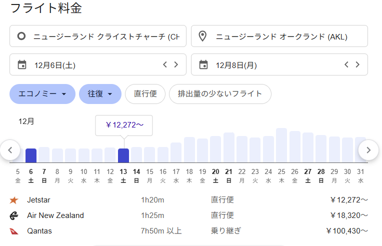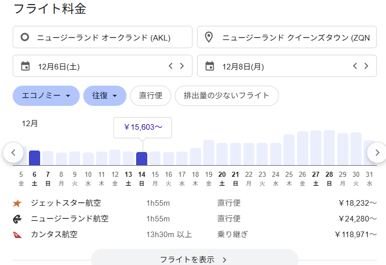 ニュージーランド南島に行きたくチケットを検索した時、いつもエコノミーが18万円くらいのイメージだったので10万程度のチケットだとお値ごろ価格に感じます!